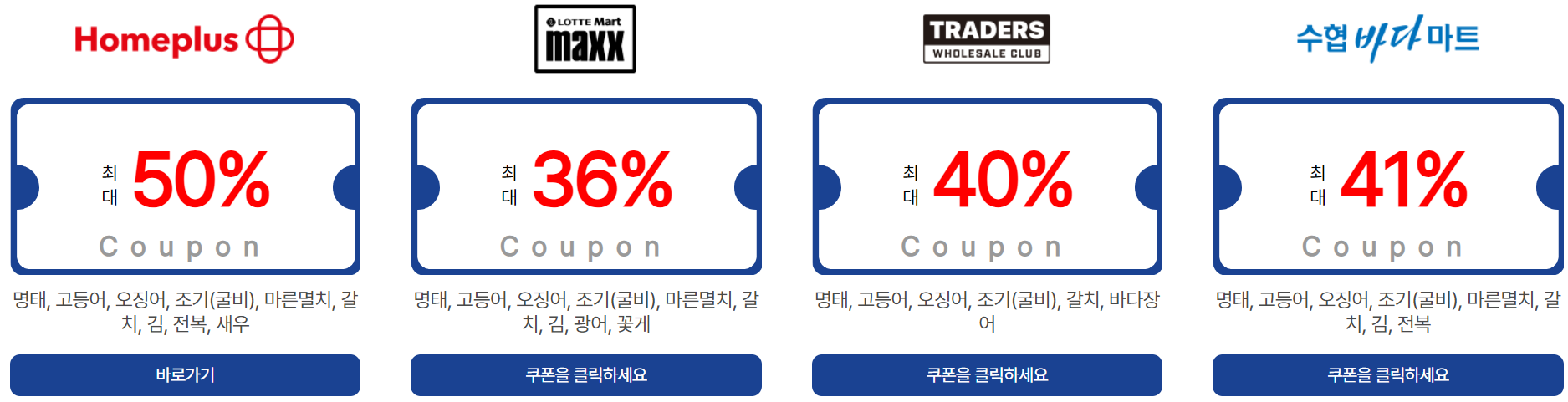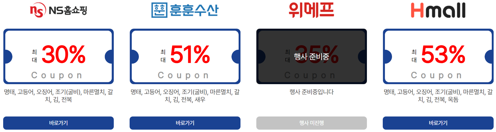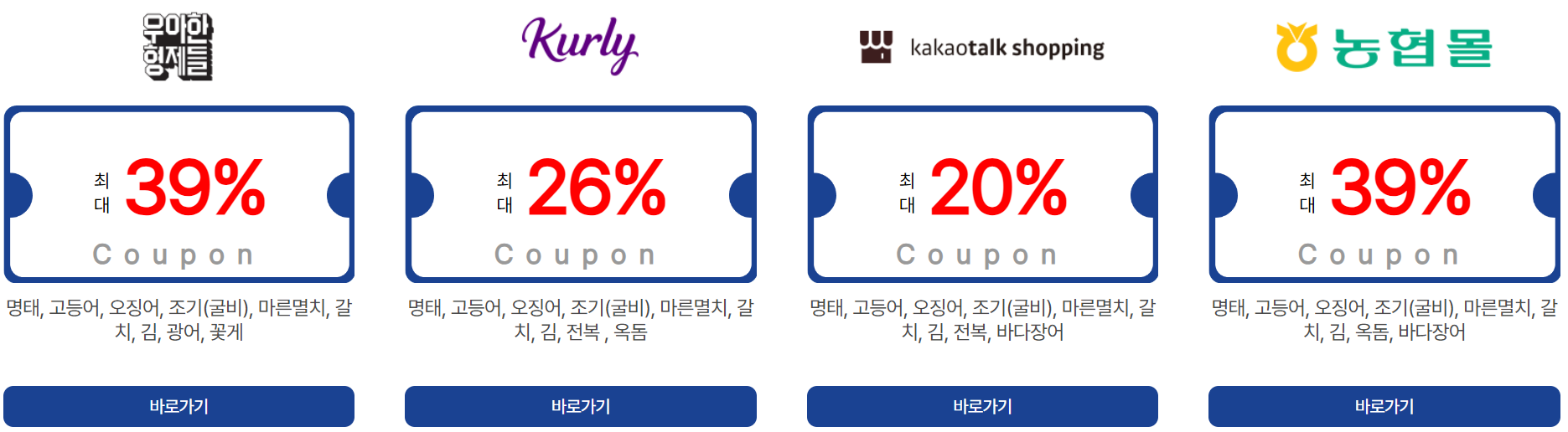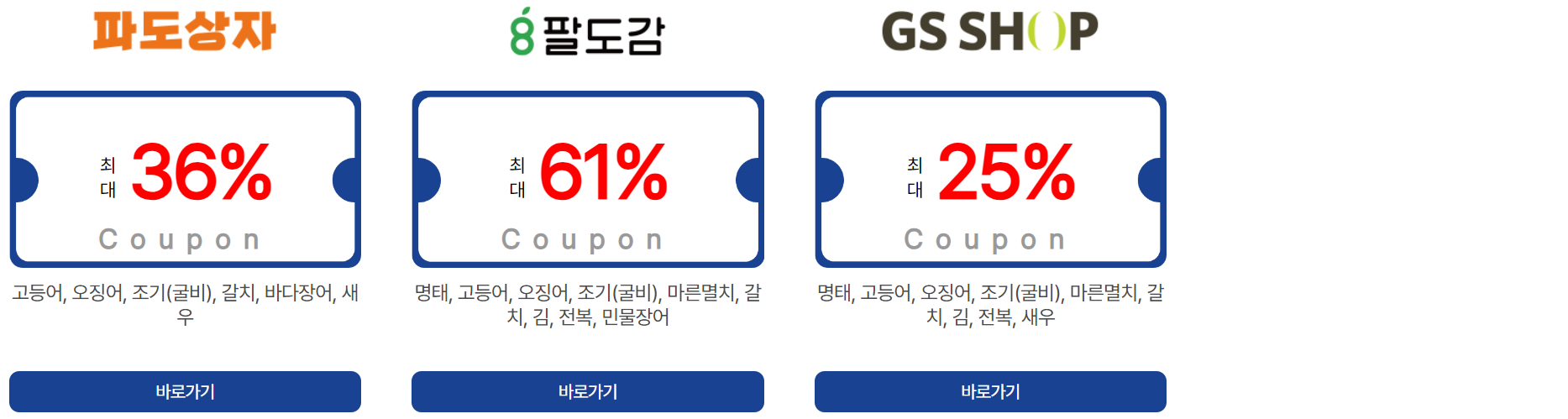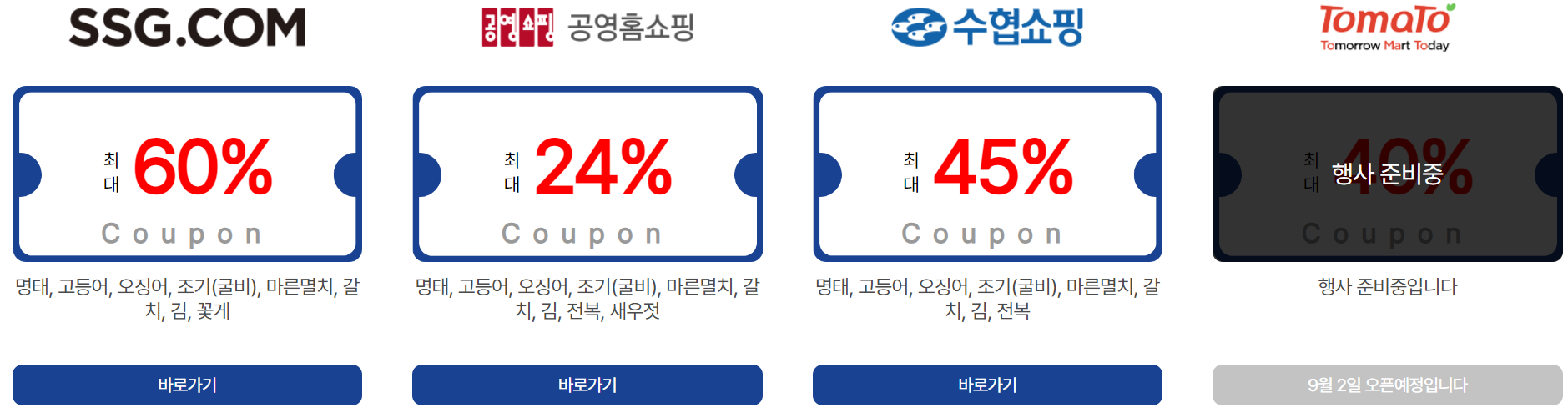 | 온라인 쇼핑몰 | SSG.COM, 공영홈쇼핑, 수협쇼핑, 토마토앱, 티몬, 11번가, 롯데백화점몰, 오아시스, 우아한형제들, 컬리, 카카오쇼핑, 농협몰, 쿠팡, AK몰, 비비수산, 캐시워크, 엔에스쇼핑, 훈훈수산, 위메프, 현대홈쇼핑, 제철장터, 우체국쇼핑, 에스케이몰, 내돈내산, 공유어장, 8도감, 지에스샵 |
