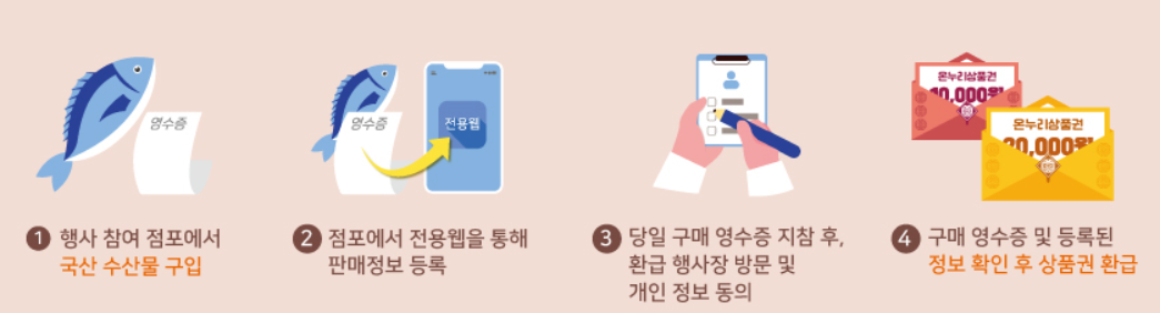 참여 점포에서 당일 국산 수산물 구매고객이시면 환급을 받을 수 있습니다.